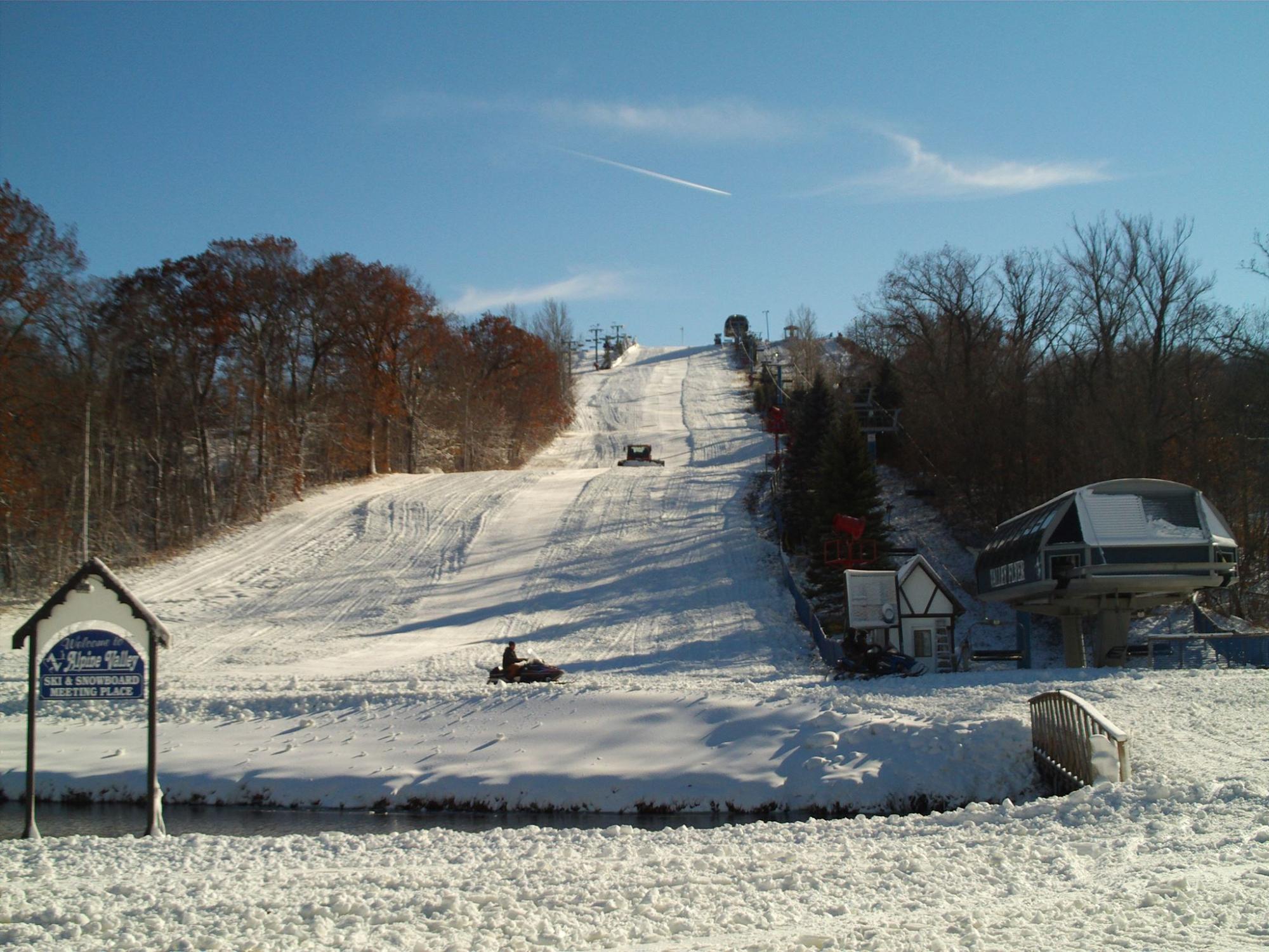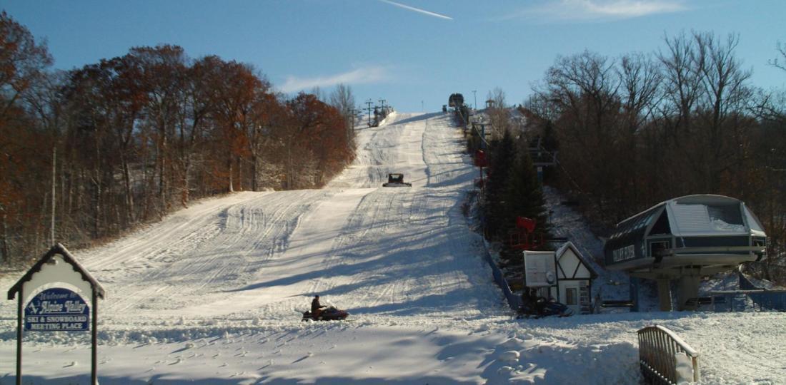 Alpine Valley Resort has over 90 skiable acres and 20 runs and a vertical drop of 388 feet. The longest run is 3,000 feet. This great resort is set in the beautiful Sugar Creek Valley in Elkhorn, with mature trees and rolling terrain common to the Kettle Moraine Area. Their ski hill provides diverse terrain for beginners through experts and a full featured Terrain Park. There are three high speed Quad Advanced Chair lift systems and four wonder carpet lifts along with professional instructors available for lessons. They are the only resort in Southeastern Wisconsin that features on-site ski-in/ski-out rooms with a full service Bistro for dining and free weekend family movie nights.