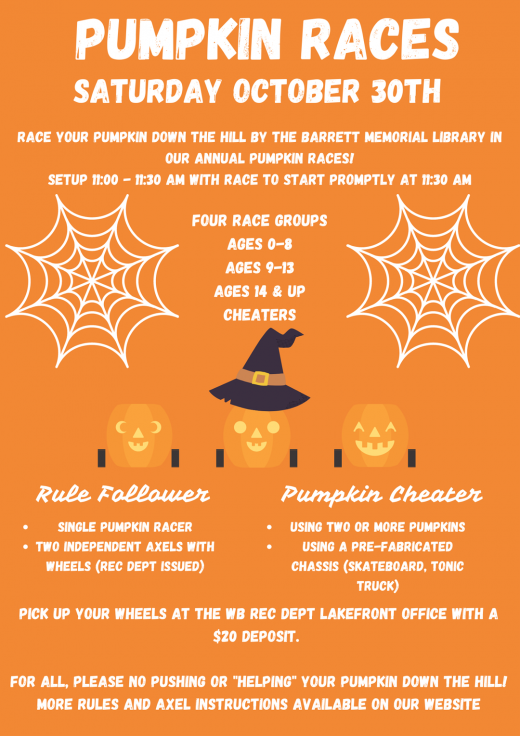 The Pumpkin Races are back! Bring your speedy pumpkin to the library at 10AM on Saturday, October 26th for the race of the year. No need to pick up wheels, race carts will be provided by the Williams Bay Rec Department. Thanks to the Williams Bay Joint Task Force for another great community event. See you there!