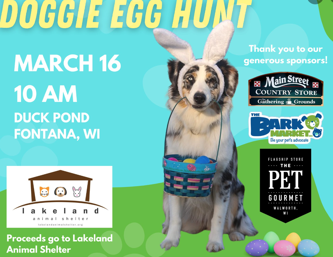 Join us for our annual Easter Egg Hunt for DOGS! You and your four legged friend will scour the grasslands of Duck Pond to find kibble filled eggs. Participants must have proof of up-to-date rabies vaccination; a rabies tag is acceptable. All dogs must remain leashed during the hunt. Rain, snow or shine! $10/dog: ALL PROCEEDS GO TO LAKELAND ANIMAL SHELTER. Please register in advance: http://tinyurl.com/ww5k2j5c