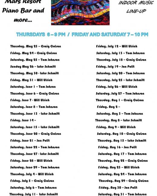 Mars Resort will host live entertainment on their lakeside decks on Thursdays from 6-9pm and Fridays and Saturdays from 7-10pm during the summer.