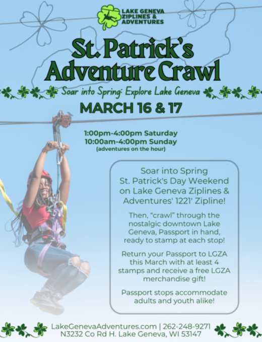 Soar into Spring St. Patrick's Day Weekend on Lake Geneva Ziplines & Adventures' 1221' Zipline!