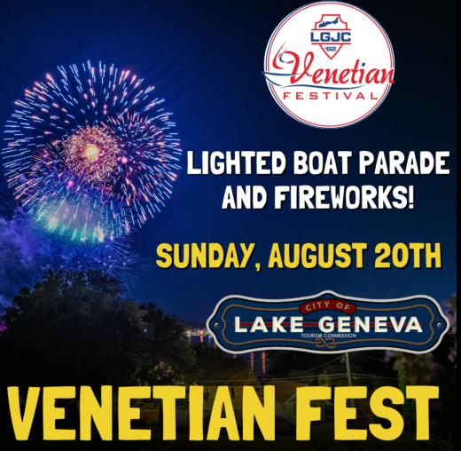 The 2024 Venetian Fest in Lake Geneva will run on August 14- 18, 2024. This will be the 62nd anniversary of the Lake Geneva Jaycees event.  The five-day Festival will take place at Flat Iron, Library, and Seminary Parks in downtown Lake Geneva.